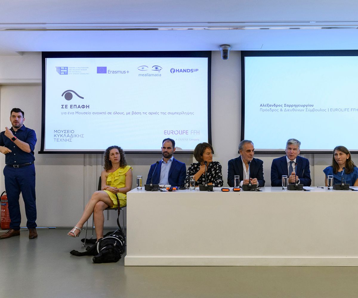 από αριστερά: Γιώργος Στάθης (όρθιος) Γενικός Διευθυντής και Ιδρυτής της κοινωνικής εταιρείας Hands Up Agency, Τζουλιάνα Μπούση φιλόλογος και χερίστρια του σκύλου- οδηγού τυφλών Γιούνι, η Γιούνι, Βαγγέλης Αυγουλάς Δικηγόρος και Πρόεδρος της ΑΜΚΕ με «Άλλα Μάτια», Μαρίνα Πλατή Διευθύντρια Εκπαιδευτικών και Κοινωνικών Προγραμμάτων Μουσείου Κυκλαδικής Τέχνης, Νικόλαος Καλτσάς Επιστημονικός Διευθυντής Μουσείου Κυκλαδικής Τέχνης, Αλέξανδρος Σαρρηγεωργίου Πρόεδρος & Διευθύνων Σύμβουλος EUROLIFE FFH, Ευγενία Χριστοδουλάκου Εκτελεστική Διευθύντρια Μουσείου Κυκλαδικής Τέχνης