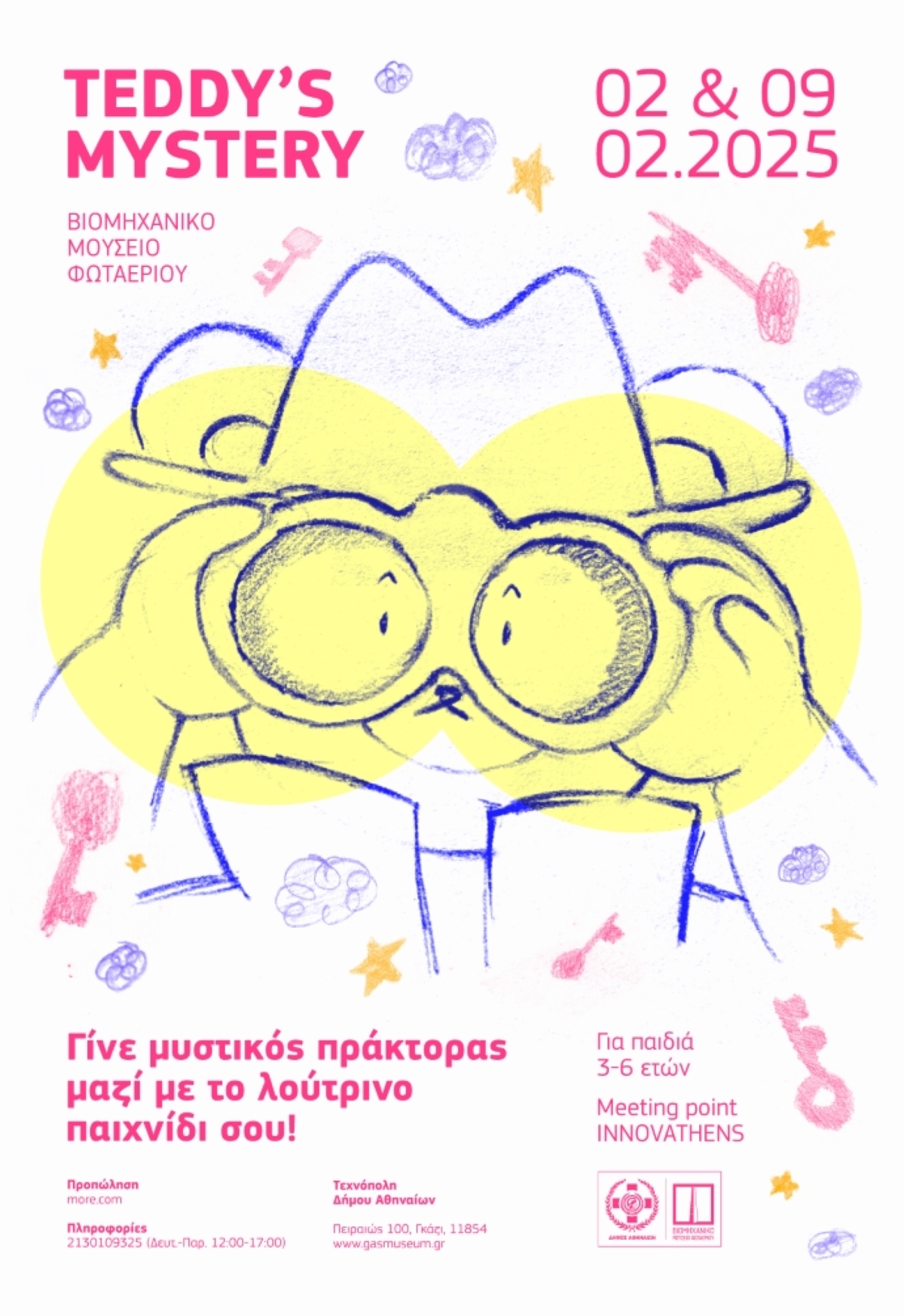Το αγαπημένο πρόγραμμα του Βιομηχανικού Μουσείου Φωταερίου, το Teddy’s, επιστρέφει για δύο συνεχόμενες Κυριακές, στις 2 και 9 Φεβρουαρίου, με μια ξεχωριστή πρωινή εκδοχή που φέρνει μαζί της έναν αέρα περιπέτειας και μυστηρίου! Αυτήν τη φορά, τα παιδιά ηλικίας 3-6 ετών μαζί με τους γονείς τους μεταμορφώνονται σε επίδοξους μυστικούς πράκτορες και, με πολύτιμο σύμμαχο τα αγαπημένα τους λούτρινα αρκουδάκια, αναλαμβάνουν να λύσουν το μυστήριο που έχει απλωθεί στους χώρους του παλιού εργοστασίου φωταερίου.