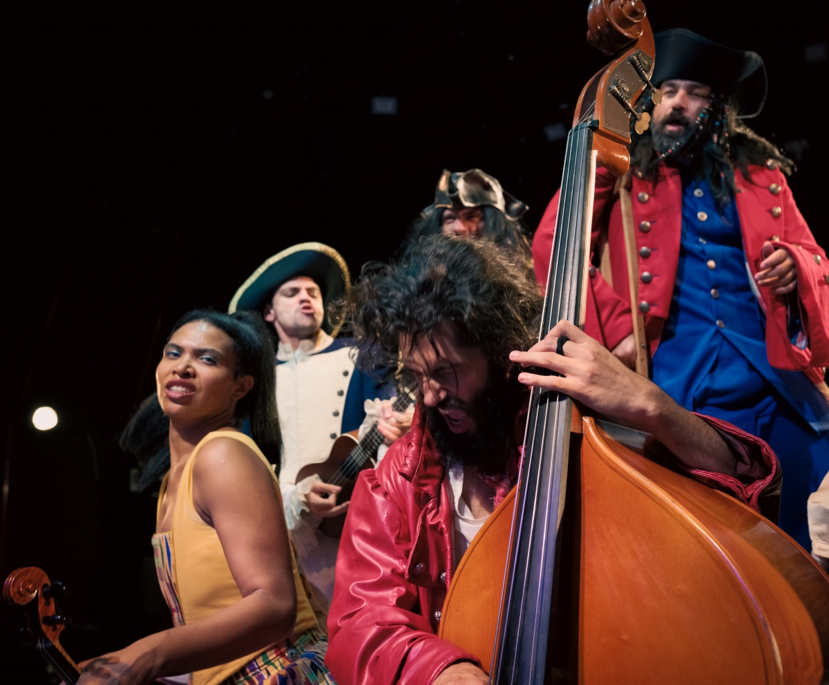 Κεντρικό σημείο της παράστασης είναι η μουσική του Κορνήλιου Σελαμσή, βασισμένη σε ναυτικούς σκοπούς και πειρατικά τραγούδια του 17ου και 18ου αιώνα, σε νέες ενορχηστρώσεις και επεξεργασία. Οι ηθοποιοί ερμηνεύουν τη μουσική και τα τραγούδια (σε στίχους Θωμά Μοσχόπουλου), παίζοντας κιθάρα, μπάντζο, κλαρινέτο, σαξόφωνο, κόντρα μπάσο, κρουστά, βιολί, ακορντεόν και πιάνο.