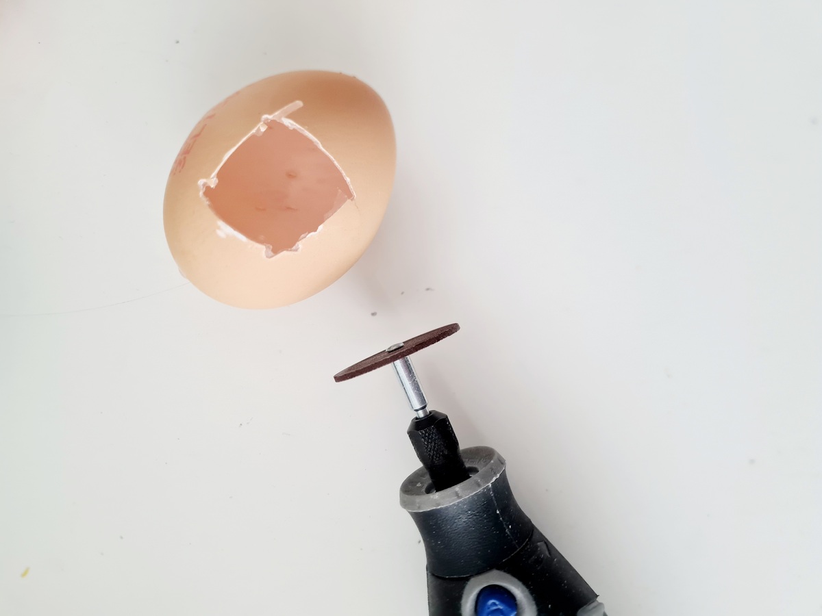 Συνεχίζουμε κάνοντας με το Dremel ένα άνοιγμα στο πίσω μέρος του αυγού. Από εκεί θα αφαιρέσουμε το περιεχόμενο (το οποίο πετάγεται πολύ εντυπωσιακά σαν πίδακας καθώς το κόβουμε, οπότε καλό θα είναι να το κάνετε πάνω από τον νεροχύτη και να έχετε μια κάμερα για να καταγράψετε το απίστευτο πιτσίλισμα που μπορεί να προκαλέσει ένα μόνο αυγό). Από το άνοιγμα αυτό θα περνάμε και τη βελόνα. Προσοχή: Αν κάνετε το art project μαζί με τα παιδιά, κρατήστε τα μακριά από το Dremel, το οποίο πρέπει να χειρίζεται μόνο ένας ενήλικας!