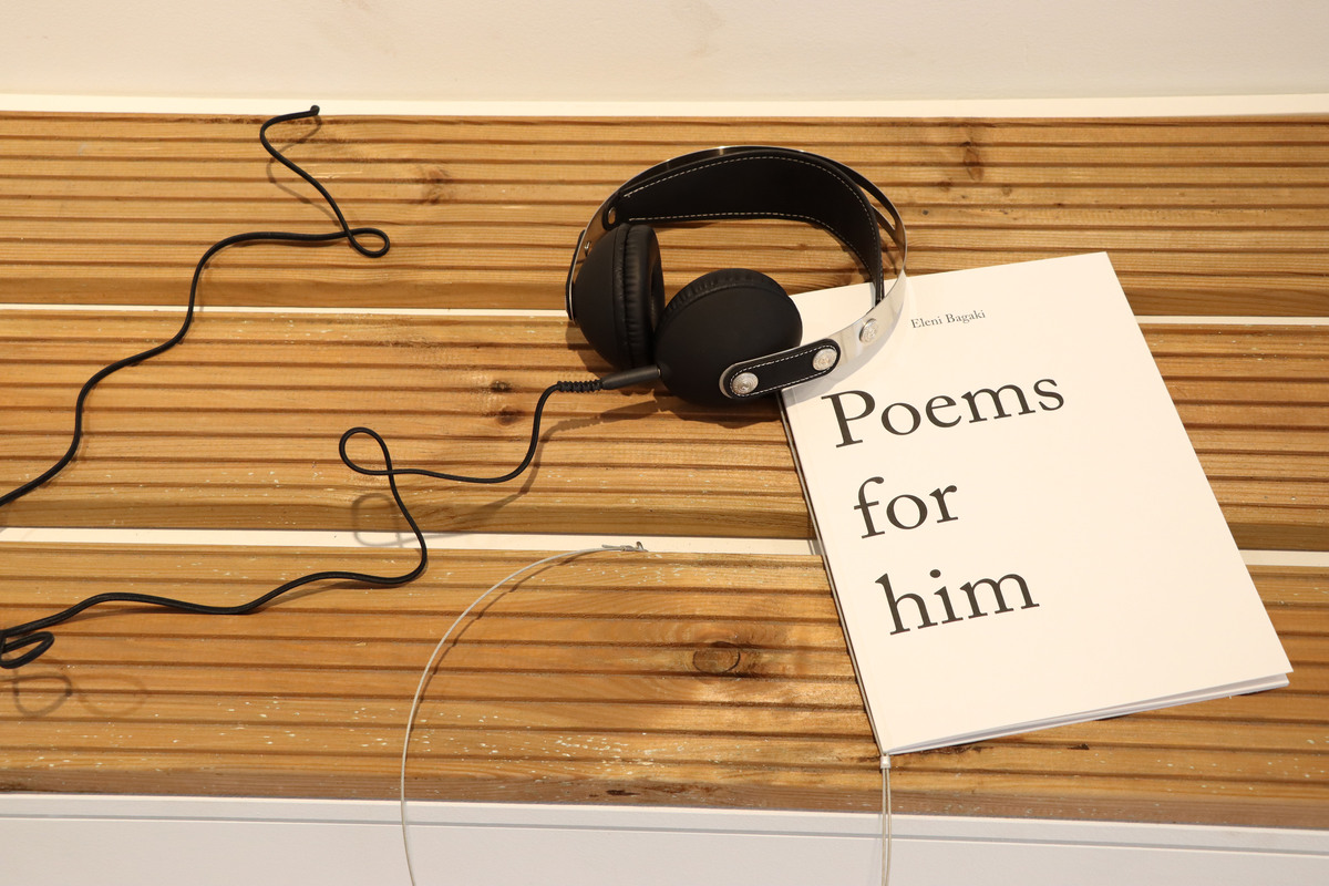 Το γράψιμο είναι αναπόσπαστο κομμάτι της πρακτικής μου και το αντιμετωπίζω με τον ίδιο τρόπο που χρησιμοποιώ και τα υπόλοιπα μέσα. Θα έλεγα γράφω σαν εικαστικός. Τα ποιήματα που παρουσιάζω εδώ με τίτλο «Poems for him», τέσσερα εκ των οποίων έγιναν τραγούδια σε συνεργασία με την μουσικό Anna vs June, τα είχα γράψει το 2016 στο κινητό μου σαν σημειώσεις ενώ περπατούσα στο κέντρο της Αθήνας.  Τα ποιήματα είναι μονόστιχα ή δίστιχα γραμμένα στα αγγλικά και αναφέρονται σε έναν «ΕΚΕΙΝΟΝ». Κάποια είναι αστεία, κάποια άλλα στενάχωρα. Όπως και να τα διαβάσει κανείς, μιλάνε για τις έμφυλες ερωτικές σχέσεις και την ερωτική αναζήτηση.