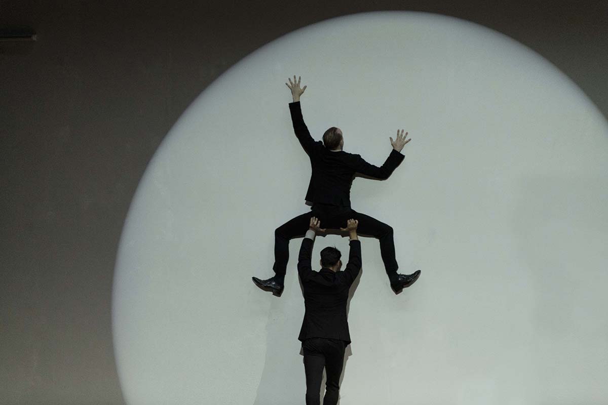 Θυμάμαι σε παλαιότερη παράσταση του Παπαϊωάννου να δημιουργούν οι χορευτές κλασικά έργα τέχνης, σαν ταμπλό βιβάν. Ο «Εγκάρσιος Προσανατολισμός» (που γεννήθηκε στο στούντιο που έχει δημιουργήσει ο Δημήτρης Παπαϊωάννου στο Μέγαρο Μουσικής, στο πλαίσιο residency) είχε και τέτοιες στιγμές, αλλά πιο αφαιρετικές. Είχε και υπέροχες «ψευδαισθήσεις», όπως ο κολυμβητής που «καταδύεται» στον βυθό και το «νερό» που αναπηδά πάνω του όταν βγαίνει.