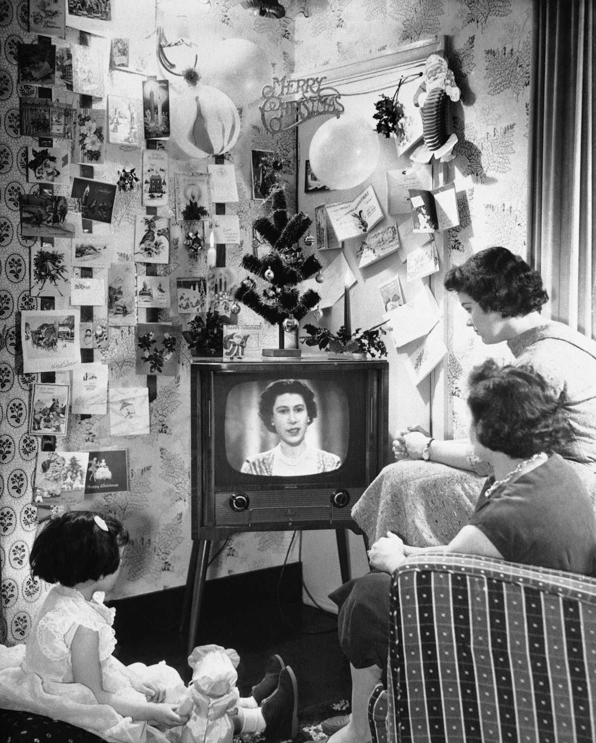Βρετανική οικογένεια παρακολουθεί το πρώτο χριστουγεννιάτικο μήνυμα της Ελισάβετ, το 1957. © AP Photo