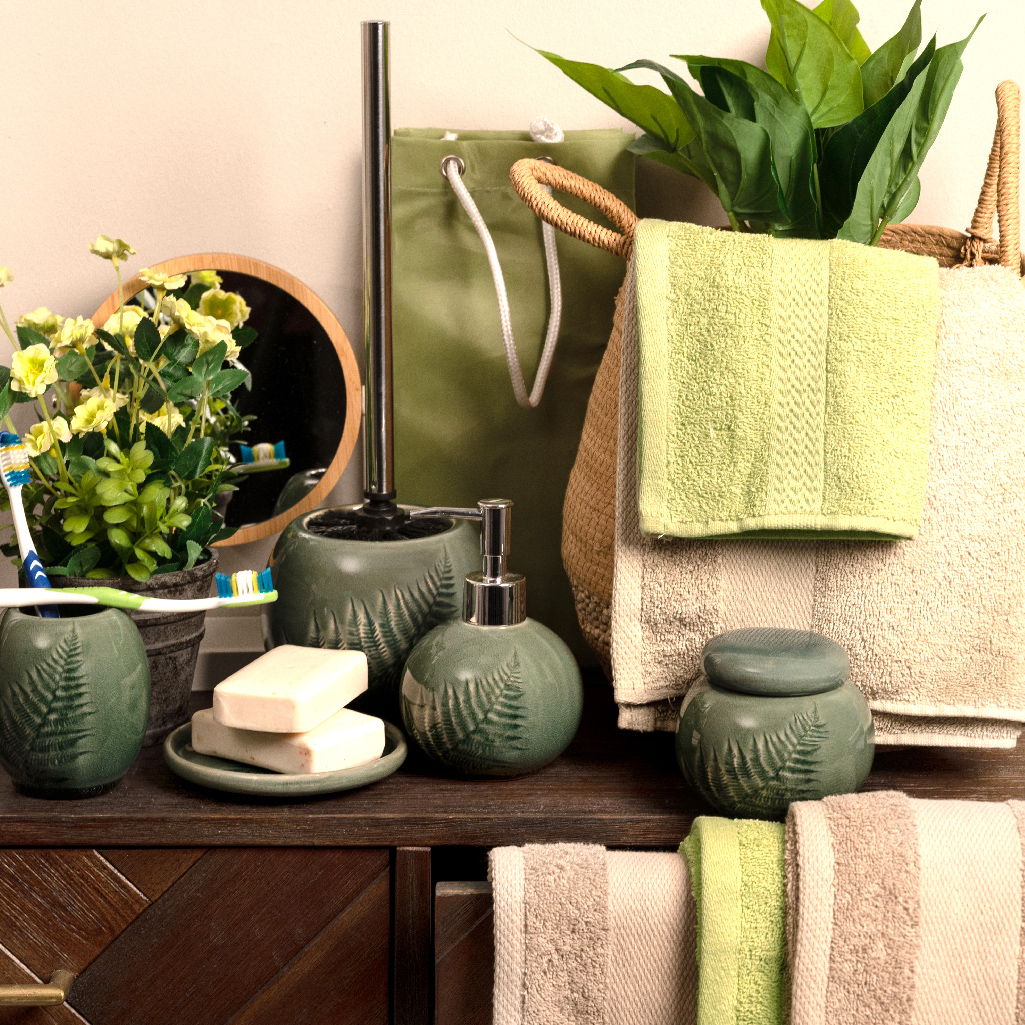Η φύση και το νερό είναι άμεσα συνδεδεμένα. Ντύστε το μπάνιο σας με πετσέτες ή χαλάκια σε πράσινες αποχρώσεις. Αν προτιμάτε τη φυσική κομψότητα του λευκού, τολμήστε να διακοσμήσετε με μικρά γλαστράκια με φυτά εσωτερικού χώρου, λουλούδια και κεριά, χρηστικά αντικείμενα σε πράσινο χρώμα και εκμεταλλευθείτε το έντονο contrast που προκύπτει.