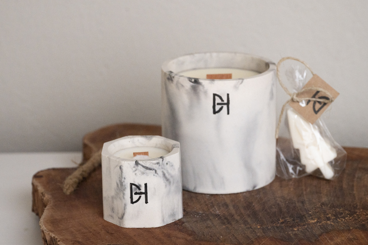 Μόλις τα τσιμεντένια κεριά της Ντόρας Χάλαρη (DH Natural soy candles), φτιαγμένα από 100% φυσικό κερί σόγιας και αρωματικά έλαια (με φιτίλια από φυσικό ξύλο), έφτασαν στο γραφείο, ο τόπος πλημμύρισε αρώματα που θύμιζαν Χριστούγεννα.
