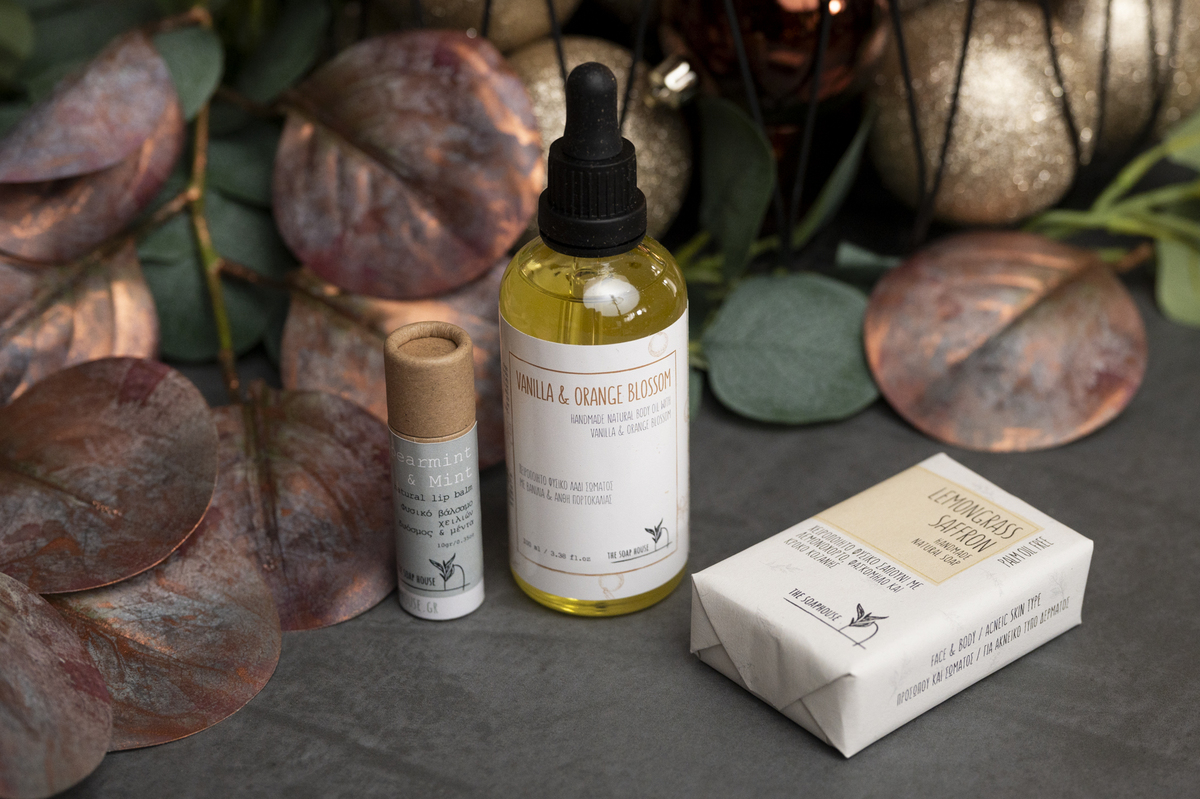 Το δεματάκι που βρήκα ως δώρο για τις γιορτές να με περιμένει περιείχε ένα φυσικό βάλσαμο χειλιών με αιθέρια έλαια μέντα και δυόσμο σε οικολογική συσκευασία (είναι ήδη στην τσάντα μου), ένα έλαιο σώματος και μαλλιών με αιθέριο έλαιο πορτοκάλι και άρωμα βανίλια, που προσφέρει ενυδάτωση και τόνωση και ένα φυσικό χειροποίητο σαπούνι ελαιολάδου ψυχρής μεθόδου με λεμονόχορτο, φασκόμηλο, κουρκουμά και Κρόκο Κοζάνης (πήρε χρυσό βραβείο στη φετινή Gourmet Exhibition).