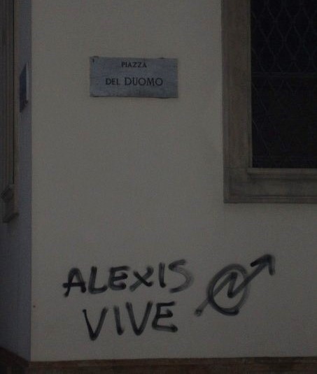 Έγραψα αυτές τις σκέψεις την παραμονή της 15ης επετείου της δολοφονίας του Γρηγορόπουλου. Κάθε χρόνο τέτοια μέρα, έχω μια φωτογραφία που τη θεωρώ πολύ «δικιά μου». Την είχαμε τραβήξει σε κάποιο δρόμο του Μιλάνου ένα ή δύο χρόνια μετά το συμβάν. Από τότε ήμουν σίγουρη ότι αναφέρεται στον Γρηγορόπουλο – γράφει «Ο Αλέξης ζει».