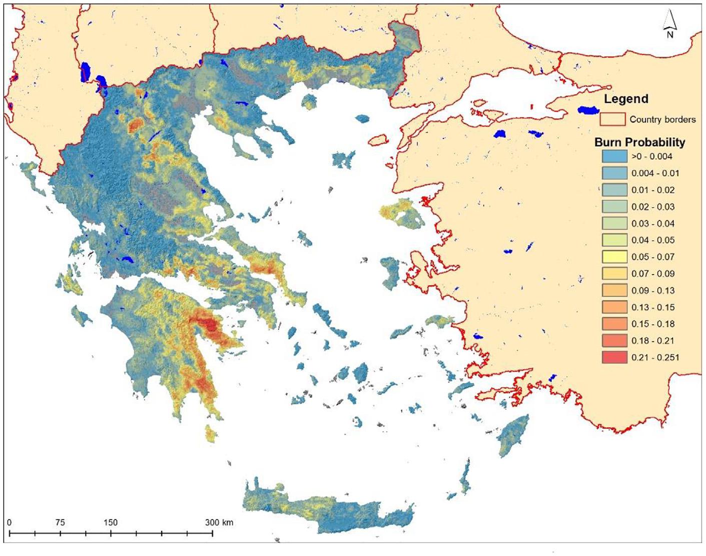 Είναι η ετήσια πιθανότητα να καεί μια περιοχή, με τιμές από σχεδόν μηδενικές έως πάνω από 0,25.