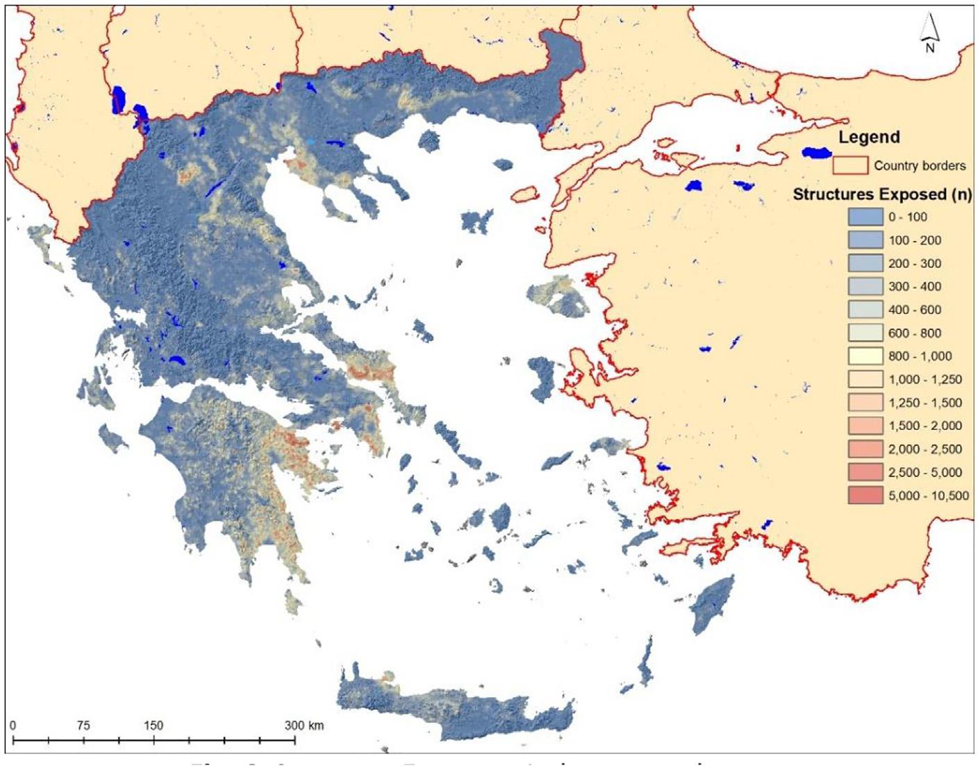 Εκτιμά πόσα κτήρια απειλούνται, μέσω διασταύρωσης των περιμέτρων πυρκαγιάς με δεδομένα αποτυπώσεων – έως και πάνω από 10.500 κατασκευές από ένα μόνο σημείο έναρξης.