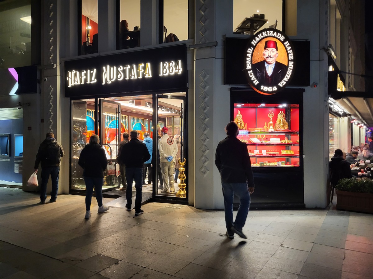 Eίμαστε πλέον στη σύγχρονη πλευρά της πόλης. Κλασικές διευθύνσεις για γλυκό το ζαχαροπλαστείο Saray για εκμέκ και το Inci για προφιτερόλ Επιλέγουμε αυτή τη φορά να κάνουμε μια στάση σε ένα από τα καταστήματα του Hafiz Mustafa, που έχουν κατακλύσει πόλη. Τα σιροπιαστά του γλυκά δικαιώνουν την απόφασή μας.