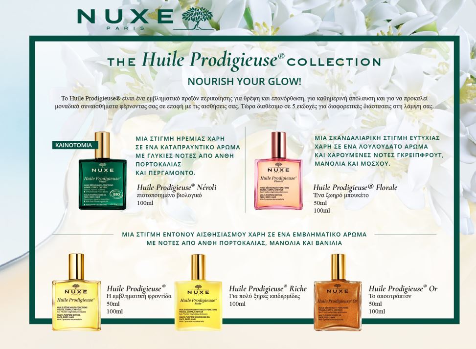 Το Huile Prodigieuse® είναι ένα εμβληματικό προϊόν περιποίησης για θρέψη και επανόρθωση, για καθημερινή απόλαυση και για να προκαλεί μοναδικά συναισθήματα φέρνοντας σας σε επαφή με τις αισθήσεις σας. Τώρα διαθέσιμο σε 5 εκδοχές για διαφορετικές διαστάσεις στη λάμψη σας.