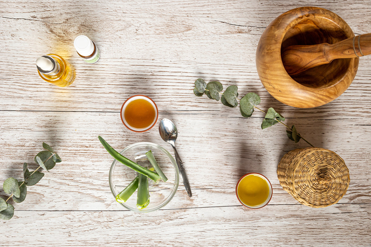Σε ένα μικρό μπολ ανακάτεψε το gel αλόης και το λάδι jojoba. Αν τα μαλλιά σου είναι ιδιαίτερα ξηρά ή ταλαιπωρημένα από τη θερμότητα και τις βαφές, πρόσθεσε μία σταγόνα έλαιο αργκάν για επιπλέον θρέψη.