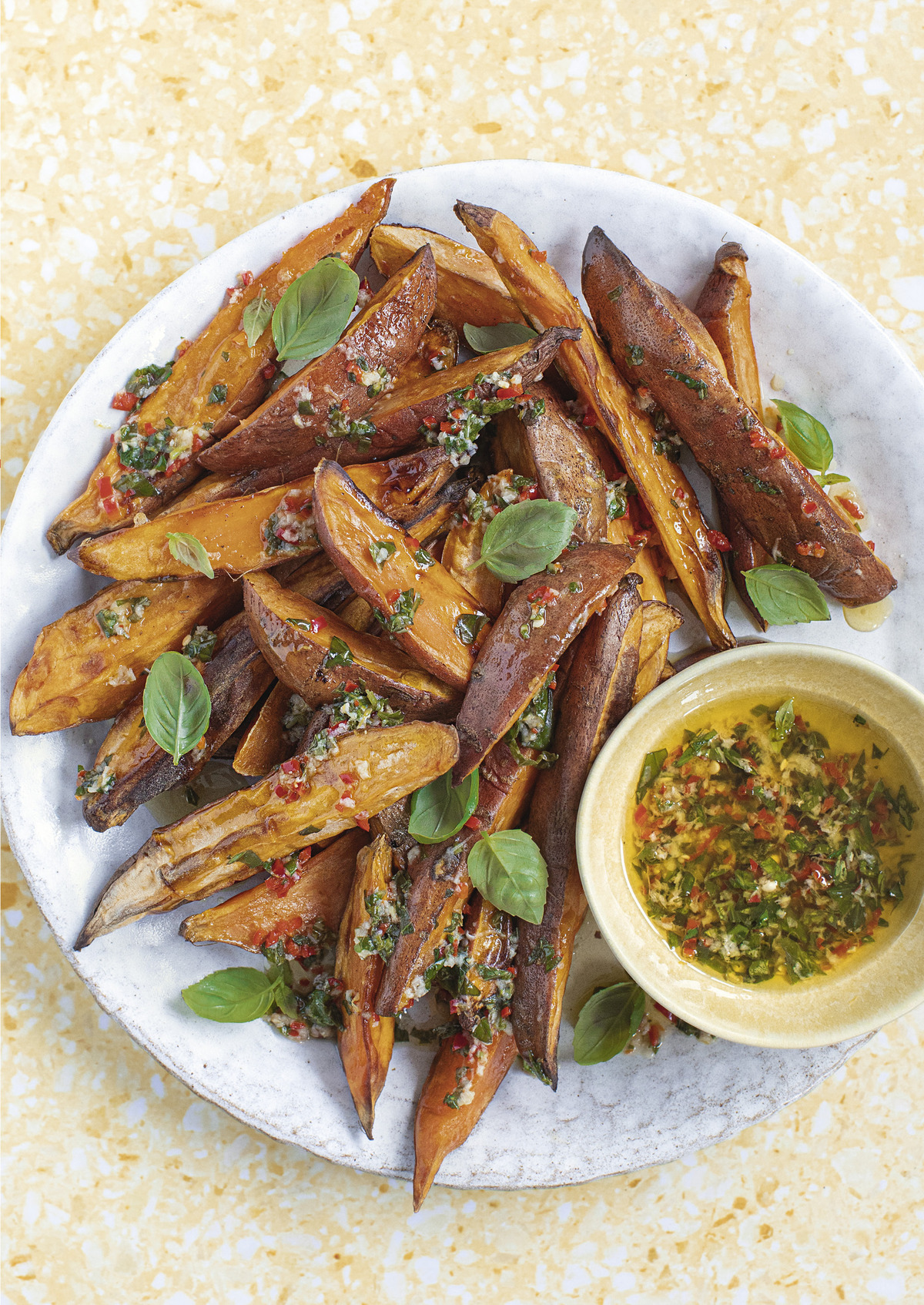 Εμείς διαλέξαμε να σου παρουσιάσουμε μία συνταγή με γλυκοπατάτες. Όπως γράφει και ο ίδιος ο συγγραφέας, «είναι απλώς υπέροχες είτε μόνες τους ως ελαφρύ γεύμα, είτε ως συνοδευτικό για τα περισσότερα φαγητά. Βασιλικός, σκόρδο, λεμόνι και τσίλι – τι θα μπορούσε να πάει στραβά; Προσωπικά, θα μπορούσα να φάω δέκα κιλά από αυτές, πόσο μάλλον ένα».