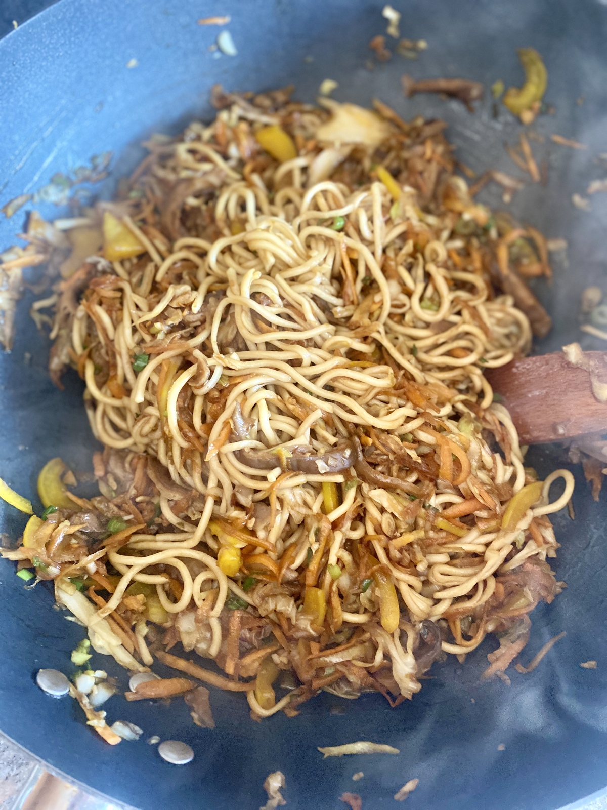 Προσθέτουμε μέσα στο τηγάνι τα noodles που βράσαμε, μαζί με 2-3 κ.σ. από το νερό που φυλάξαμε. Ανακατεύουμε με γρήγορες κινήσεις μέχρι να διανεμηθεί παντού η σάλτσα. Αν είναι στεγνά, προσθέτουμε λίγο ακόμα νερό από τα βρασμένα noodles.