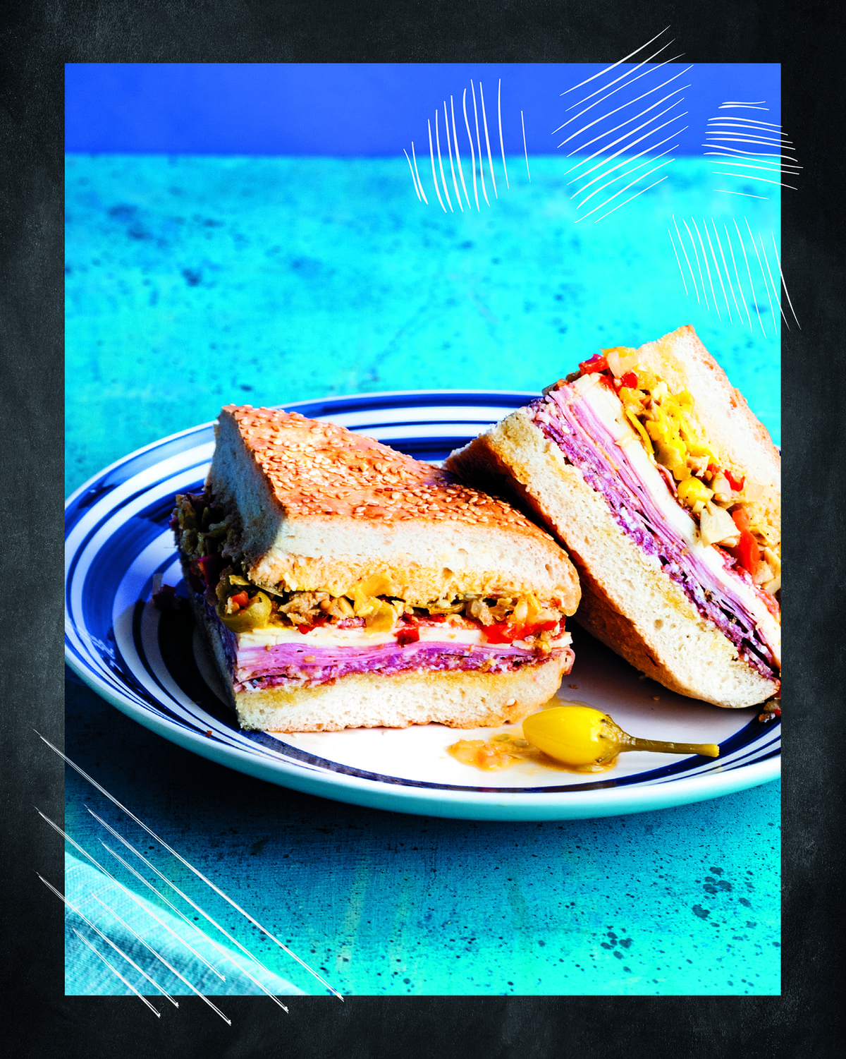 Σκεπάζουμε τη μία φέτα ψωμιού με τις μισές φέτες από το ζαμπόν, το σαλάμι και τη μορταδέλα. Προσθέτουμε όλη την ποσότητα από το έμενταλ και το προβολόνε. Στη συνέχεια προσθέτουμε τις υπόλοιπες φέτες από τα αλλαντικά. Τυλίγουμε το σάντουιτς με πλαστική σακούλα τροφίμων και το βάζουμε στο ψυγείο, τοποθετώντας επάνω στη σακούλα ένα βαρύ μαντεμένιο μικρό σκεύος. Αφήνουμε για 1 ώρα και κατόπιν αποσύρουμε το σκεύος.