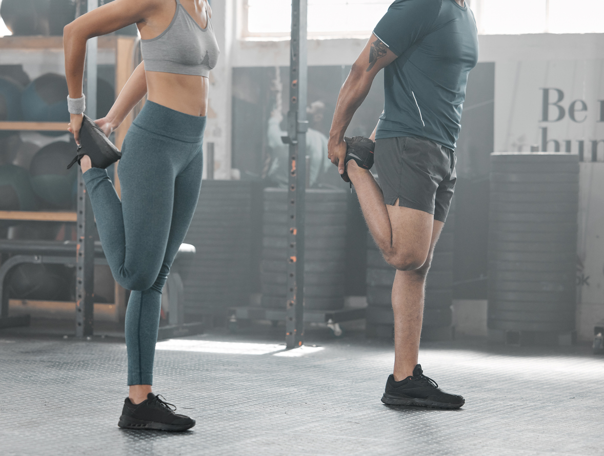 Fit, active and strong couple doing a warmup and stretching before a workout at the gym. Sporty boyfriend and girlfriend doing stretches to avoid injury, soreness and painful muscles during exercise