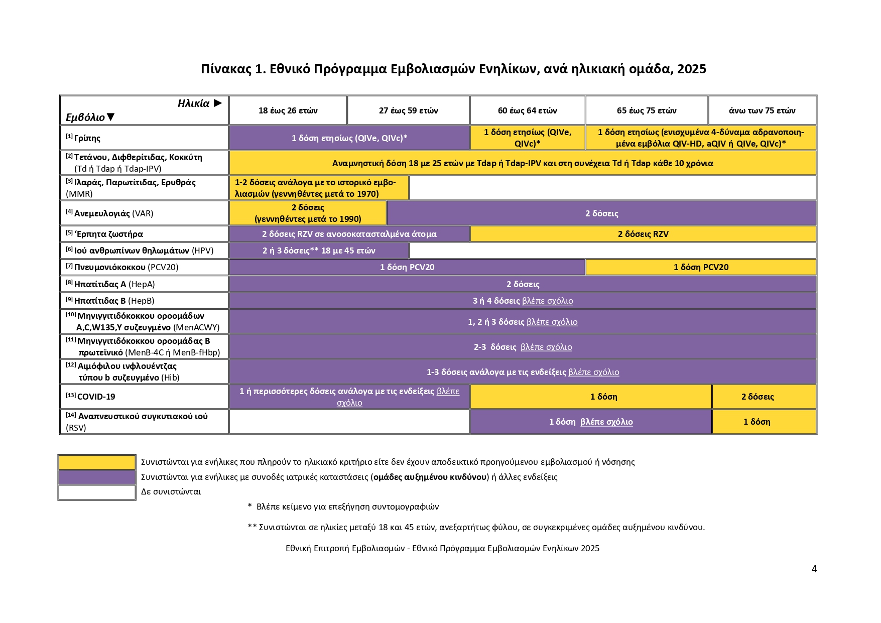 Αν αναρωτιέσαι πότε και ποια εμβόλια πρέπει να κάνεις, δες τον πίνακα του Εθνικού Προγράμματος Εμβολιασμών Ενηλίκων. Να θυμάσαι ότι, βάσει νόμου που ψηφίστηκε τον Μάρτιο του 2024, όλοι οι παρακάτω εμβολιασμοί μπορούν να γίνουν από αδειούχο φαρμακοποιό, εξαιρουμένων των ανοσοκατασταλμένων ασθενών για τα εμβόλια ζώντων εξασθενημένων ιών και των εγκύων για όλα τα εμβόλια πλην του εμβολίου της γρίπης.