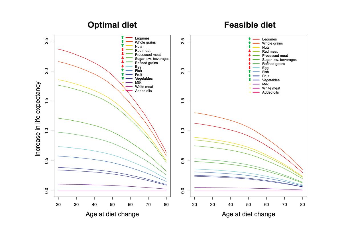 Ελάχιστοι, όμως, μπορούν να κάνουν μεγάλες θυσίες και να κόψουν μαχαίρι κάθε επιβαρυντική διατροφική συνήθεια. Οι περισσότεροι δεν θέλουμε να στερηθούμε το παραδοσιακό σουβλάκι. Έτσι, οι ειδικοί υπολόγισαν χωριστά την επίδραση που έχει η αυξημένη πρόσληψη κάθε φυτικής ομάδας τροφίμων και/ή η μείωση της κατανάλωσης ομάδων τροφίμων που συνδέονται με υψηλότερα ποσοστά ασθενειών και θνησιμότητας.